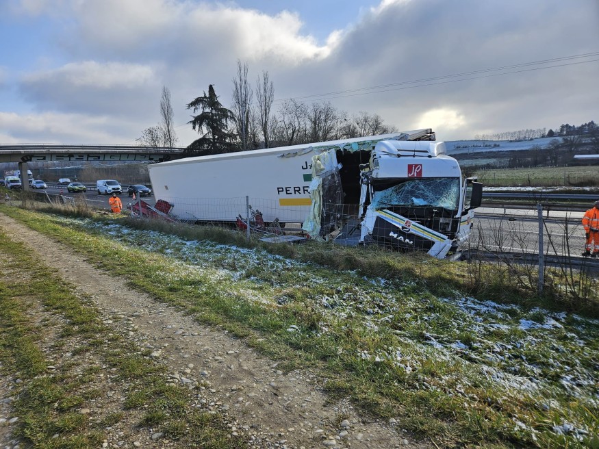 [Mise à jour le 19/01/24 à 14h] Accident clos. Le chauffeur a été transporté au Centre Hospitalier Pierre-Oudot à Bourgoin-Jallieu, avec des douleurs cervicales. Les pompiers ont siphonné le gasoil tombé sur la chaussée qu'ils ont ensuite saupoudrée de sable absorbant.