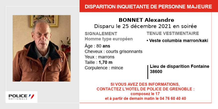 Ce lundi 27 décembre en fin d’après-midi, la police a lancé un appel à témoins après la disparition, jugée inquiétante, d’un homme de 80 ans, Alexandre Bonnet, à Fontaine.