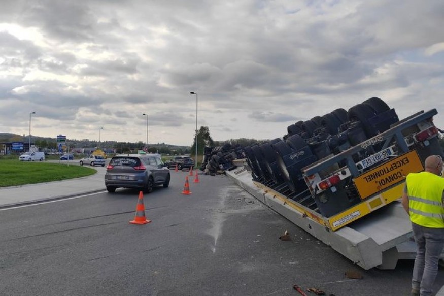 Le véhicule qui transporte des poteaux de plus de 20 mètres, s'est couché sur le bas coté aux abords du rond point du Mc Donald's vers 15h45.
