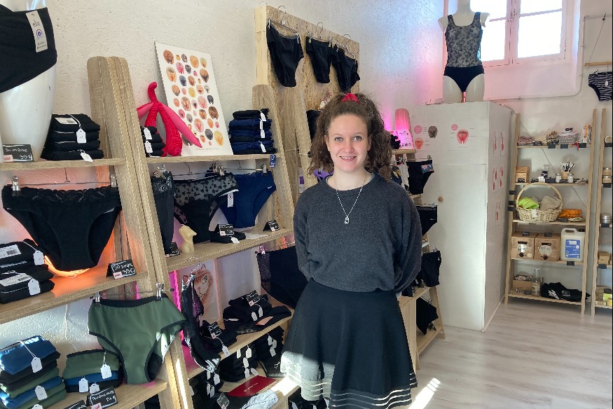 Quand on arrive devant le magasin, on ne peut pas se tromper : « Sang tabou », « Parlons peu, parlons règles » ou encore « Kiffe ton cycle », peut-on lire sur la vitrine.