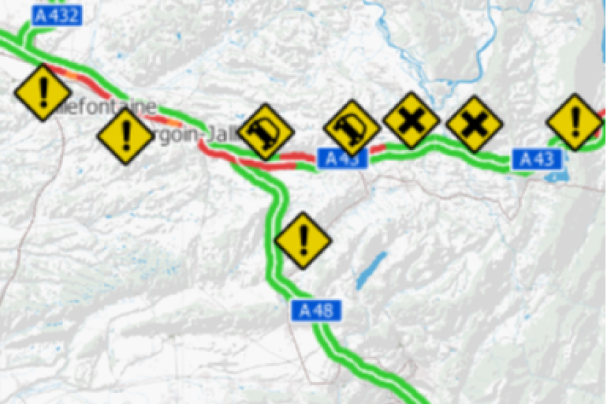 Au moins 10 km de bouchons sont signalés en amont. La sortie à Saint-Genix sur Guiers est conseillé. Les échangeurs de Saint-Genix-sur-Guiers et de Chimilin pour prendre l'autoroute, sont fermés actuellement.
