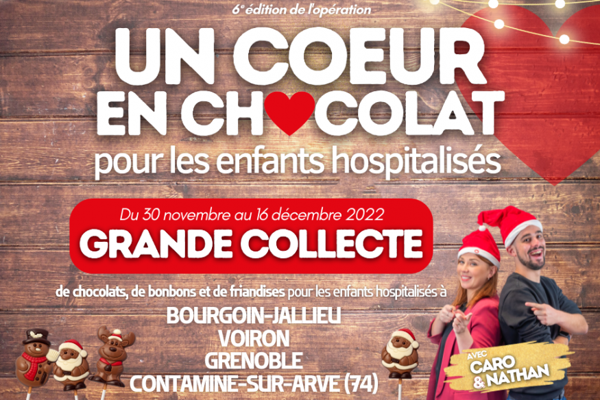 Radio ISA lance la 6ème édition de son opération "Un Coeur en Chocolat" pour les enfants hospitalisés du mercredi 30 novembre au vendredi 16 décembre 2022. L'objectif est de collecter un maximum de chocolats, de bonbons et de friandises, qui seront redistribués aux enfants dans les hôpitaux de Bourgoin-Jallieu, Grenoble et Voiron pour Noël.