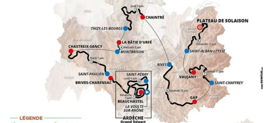 Les premières étapes passeront par la Haute-Loire, le Puy-de-Dôme, le Rhône, la Loire et la Saône-et-Loire lors de journées taillées pour les grimpeurs avant d’arriver en Isère.