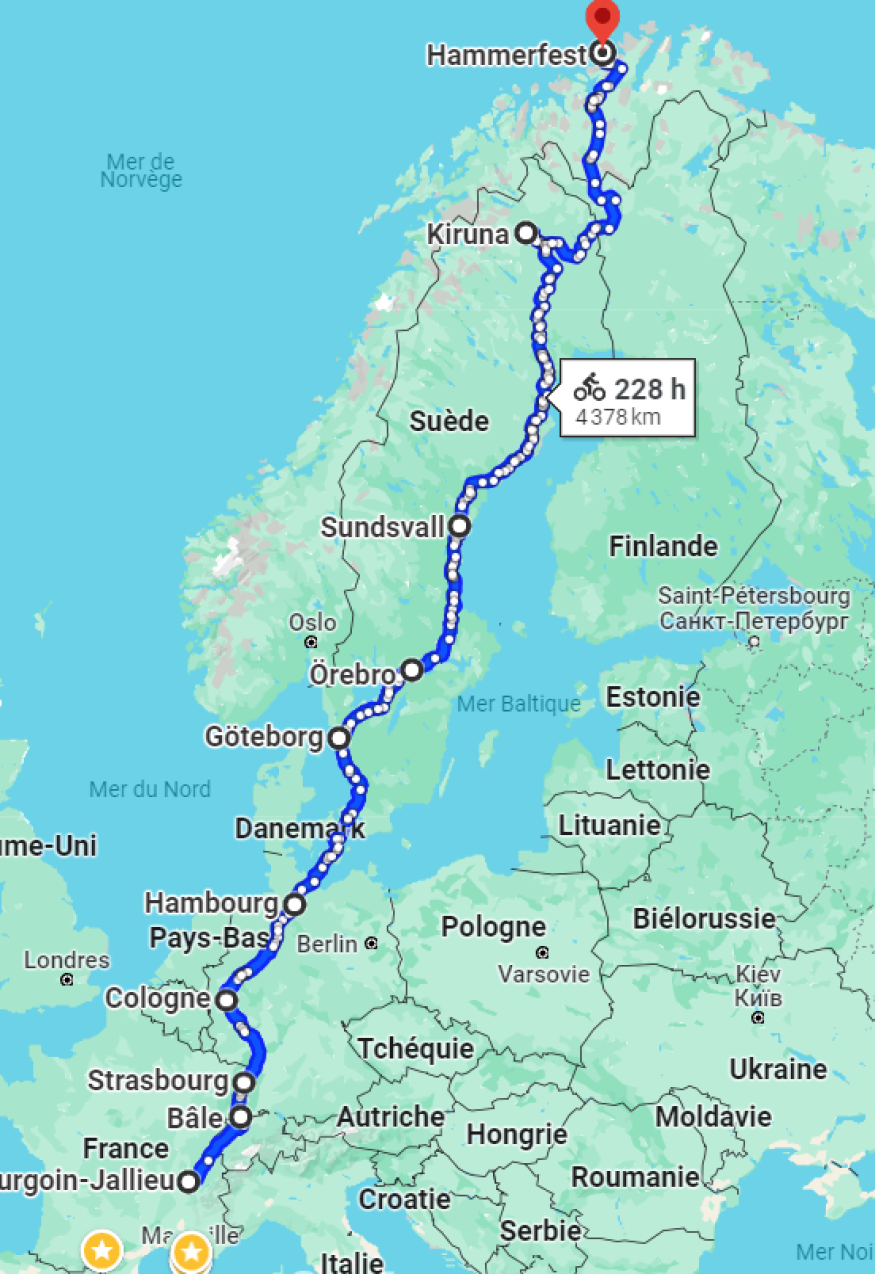 C'est un voyage fou que vient de commencer Aurélie Ferlet ce samedi 1er juin. Cette berjallienne de 32 ans a décider de rallier la place Carnot de Bourgoin-Jallieu au Cap Nord en Norvège. Elle passera par plusieurs pays dont la Suisse, l'Allemagne, le Danemark, la Suède, un petit peu la Finlande et la Norvège bien sûr. Et tout en vélo s'il vous plaît ! Un deux-roues qui n'a aucune assistance électrique. Juste la force des mollets. Un voyage qui sera également synonyme de rencontres au gré des kilomètres parcourus.