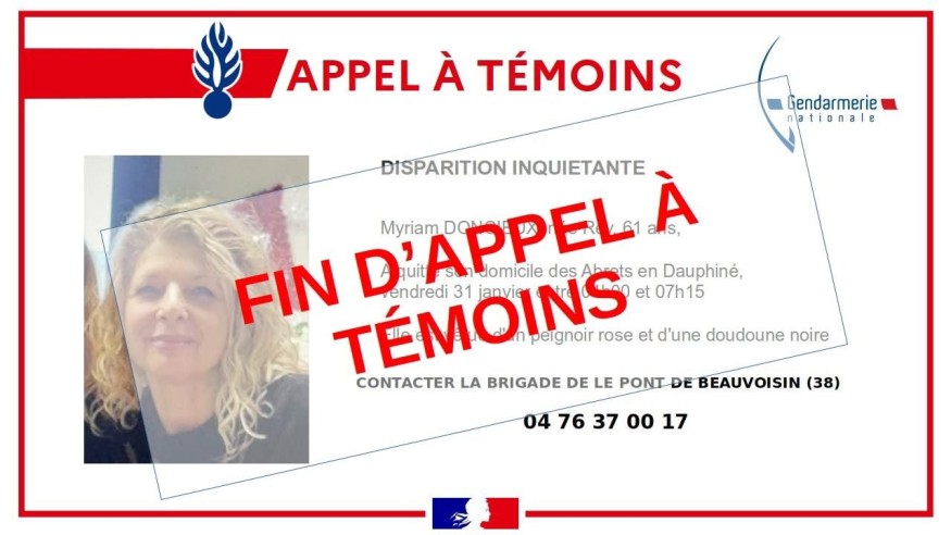 Myriam Doncieux, 61 ans, portée disparue depuis le matin du 31 janvier aux Abrets-en-Dauphiné, a été retrouvée sans vie ce samedi 1er février. Sa disparition avait mobilisé une vaste battue citoyenne encadrée par les forces de l'ordre.
