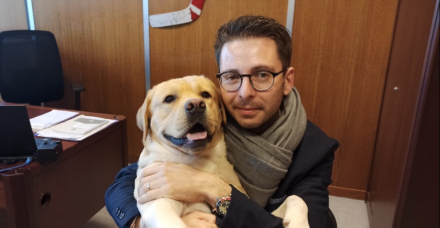 Ce n’est pas tous les jours que l’on a la possibilité d’entrer dans le bureau d’un élu, encore moins dans celui d’un élu accompagné de son chien. Quelques jours par semaine, Maxence Alloto, adjoint au maire de Grenoble en charge de l’économie locale, du commerce, de l’artisanat et de la vitalité de proximité, vient en mairie accompagné de Pixel, un beau labrador de deux ans et demi.