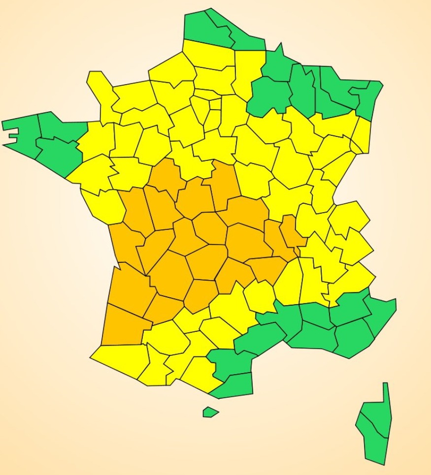 A noter enfin que 21 départements français sont placés en vigilances orange aux orages : le Rhône, la Loire, la Charente, la Charente-Maritime, la Gironde, les Deux-Sèvres, l'Indre, l'Indre-et-Loire, du Cher, l'Allier, le Lot-et-Garonne, la Dordogne, le Lot, le Cantal, la Corrèze, la Haute-Vienne, la Vienne, la Creuse, la Haute-Loire, le Puy-de-Dôme et les Landes.