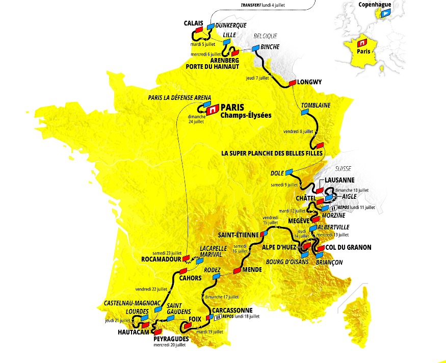 Le tracé du parcours de la 109ème édition a été dévoilé ce jeudi 14 octobre au Palais des Congrès de Paris. Une édition marquée par un départ le 1er juillet et trois journées au Danemark, une première. Le peloton empruntera aussi quelques secteurs pavés de Paris-Roubaix mais également la Planche de Belles Filles ou encore le col du Granon dans les Alpes, que l’on avait plus vu depuis 36 ans sur le Tour.