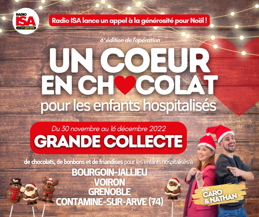Radio ISA lance la 6ème édition de son opération "Un Coeur en Chocolat" pour les enfants hospitalisés du mercredi 30 novembre au vendredi 16 décembre 2022. L'objectif est de collecter un maximum de chocolats, de bonbons et de friandises, qui seront redistribués aux enfants dans les hôpitaux de Bourgoin-Jallieu, Grenoble et Voiron pour Noël.