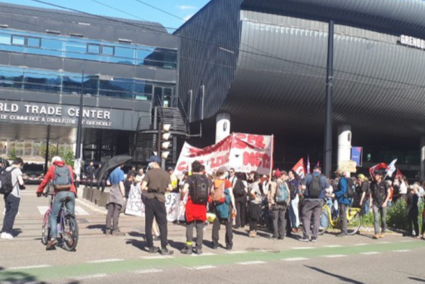 Elles se sont rassemblées vers 15h30 devant les locaux du MEDEF Boulevard Maréchal Foch avant de se rendre devant l’école de Management ou devait se tenir une conférence du MEDEF de l’Isère sur le « greenwashing ». Elle avait finalement été annulée selon nos infos.